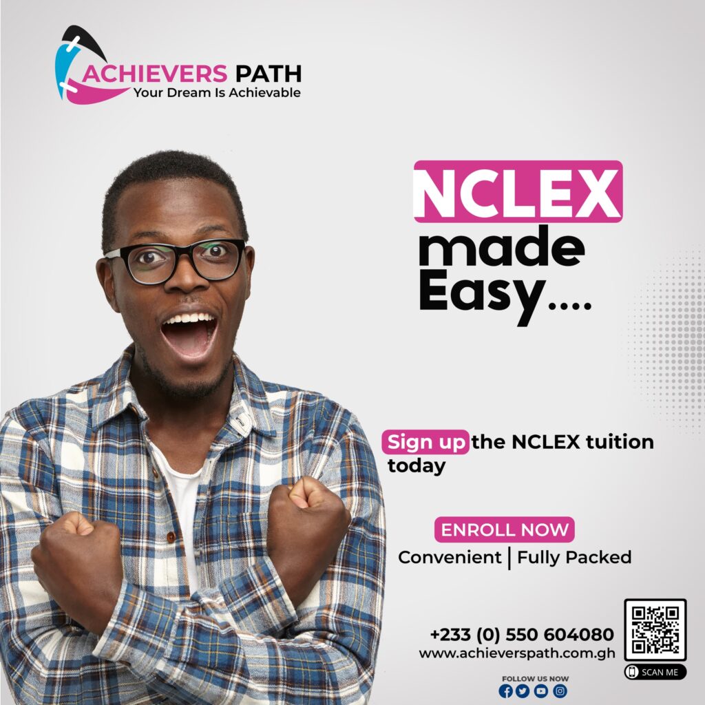 We are the premier and leading NCLEX-RN coaching and processing agency in Ghana. We have tutored over 200 nurses for the NCLEX and our proven approach of tutoring has yielded an NCLEX pass rate of over 95% over the past 2 years Your first attempt success is guaranteed! Trust our proven track record of tutoring students to pass the NCLEX-RN exam.